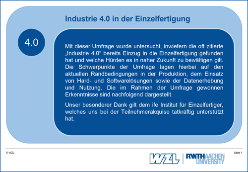 Aus diesem Grund hat das WZL der RWTH Aachen Anfang 2017 eine Studie durchgeführt, welche die aktuellen Herausforderungen sowie die Potenziale von Industrie 4.0 für die Einzelfertigung untersucht hat. Dabei standen sowohl die aktuellen Voraussetzungen wie die zur Verfügung stehende IT-Infrastruktur, der aktuelle Einsatz innovativer Lösungen bspw. zur Datenanalyse als auch zukünftige Entwicklungen wie die Unterstützung durch Smart Devices und Smart Services im Focus. Ziel der Studie war neben der Erhebung des Status quo die Identifikation von Erfolgsfaktoren und Herausforderungen im Kontext der Digitalisierung und Vernetzung.